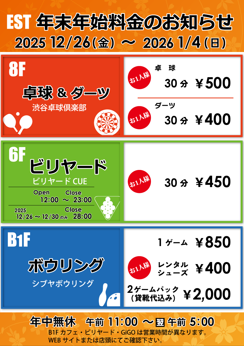 渋谷の真ん中!定番レジャーが詰まったアミューズメントビル 最新情報 お知らせ キャンペーン 撮影情報 Pickup情報2025.12.18 【EST】年末年始も休まず営業します お知らせ2025.12.13 【ビリヤード】12/26(金)~12/30(火)の営業時間延長について Pickup情報2025.10.01 【ボウリング&カフェ】4名様からのお得なセットプラン! お知らせ2025.09.26 【EST】料金改定のお知らせ 2025年10月1日より お知らせ2025.12.13 【ビリヤード】12/26(金)~12/30(火)の営業時間延長について お知らせ2025.09.26 【EST】料金改定のお知らせ 2025年10月1日より お知らせ2025.06.27 【予約代行サービス「Auto Reserve(オートリザーブ)」からのご予約お断りについて】 Pickup情報2025.12.18 【EST】年末年始も休まず営業します Pickup情報2025.10.01 【ボウリング&カフェ】4名様からのお得なセットプラン! Pickup情報2025.09.03 今しか買えない限定販売ソックスが登場! 撮影情報2025.09.03 【Duet9月号】月刊芸能誌 撮影 撮影情報2025.09.03 【極楽とんぼ山本圭壱けいちょんチャンネル】YouTube 撮影 撮影情報2025.09.03 【LIIiEN】YouTube 撮影 撮影情報2025.09.03 【-4cus-】撮影 撮影情報2025.06.11 【Officialカリスマ3】YouTube 撮影 撮影情報2025.06.11 【上田まりえ】YouTube 撮影 撮影情報2025.03.11 【アイ=ラブ!げーみんぐ】テレビ朝日 撮影 撮影情報2025.03.11 【マユリカ】マユリカの東京友錠生活 撮影 一覧をみる PICKUP 【EST】年末年始も休まず営業します 遊び納めも。遊び始めも。年末年始料金はこちらから 【ボウリング&カフェ】4名様からのお得なセットプラン! ボウリング(90分)とカフェ(料理コース+飲み放題)のお得なセットプラン!飲んだ後にエンジョイ!投げた後にパーティ! 今しか買えない限定販売ソックスが登場! 【シブヤボウリング】【ビリヤードCUE】【渋谷卓球倶楽部】各フロントでしか購入できない限定品です! EST渋谷東口会館 館内撮影 受付中 ボウリング・ビリヤード・卓球・ダーツ・カフェ 各フロア撮影可能詳細はコチラ 撮影NAVI.COM B1/3F-5FBOWLING B1CAFE 6FBILLIARD 8FDARTS 8FPING PONG 1F/7FGAME